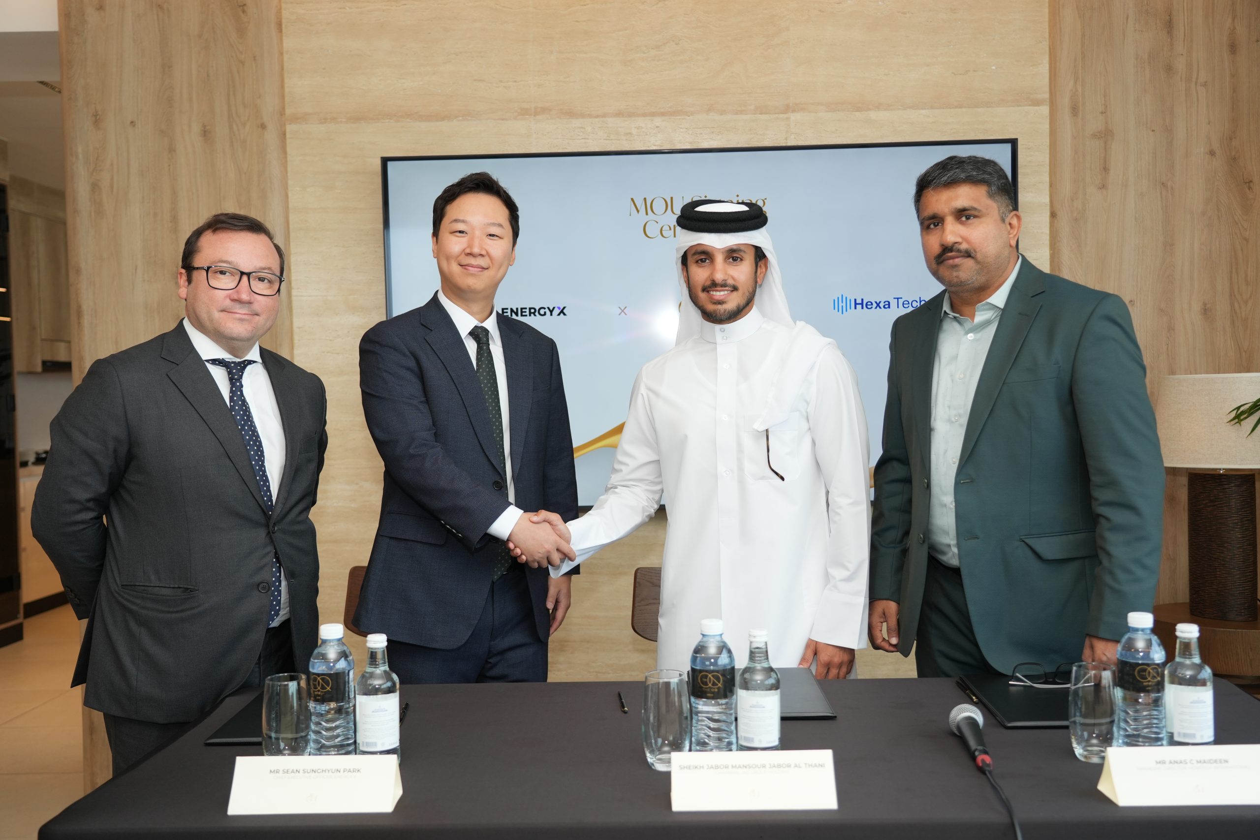 The MoU was formally signed by Sheikh Jabor bin Mansour bin Jabor bin Jassim Al Thani, Chairman and Managing Director of JMJ Group Holding; Mr. Sean Sunghyun Park, Chief Executive Officer of EnergyX; and Mr. Anas C. Maideen, Managing Director of Hexatech International. The event included a ceremonial signing, document exchange, and a reception attended by key delegates.
